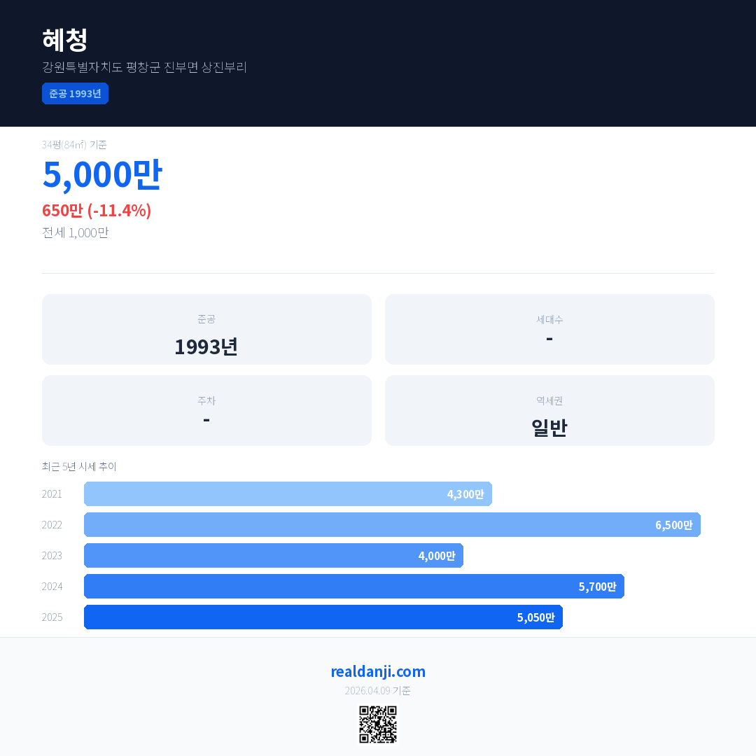 혜청 국민평형 기준 2025년 평균 거래가는 5,050만으로, 전년 대비 11.4% 하락 했습니다.