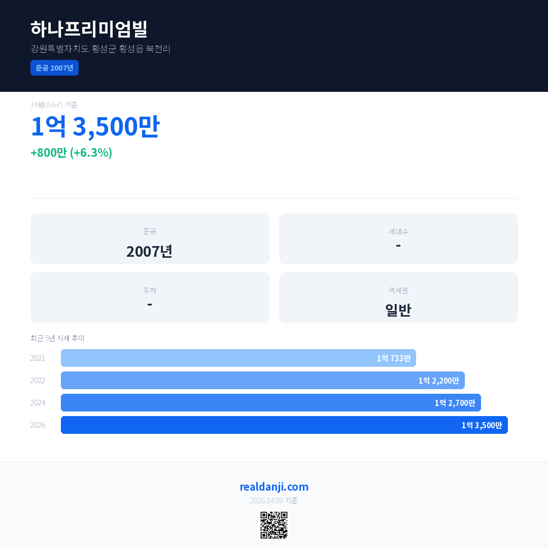 하나프리미엄빌 최근 거래가는 1억 3,500만입니다. (2026-03)