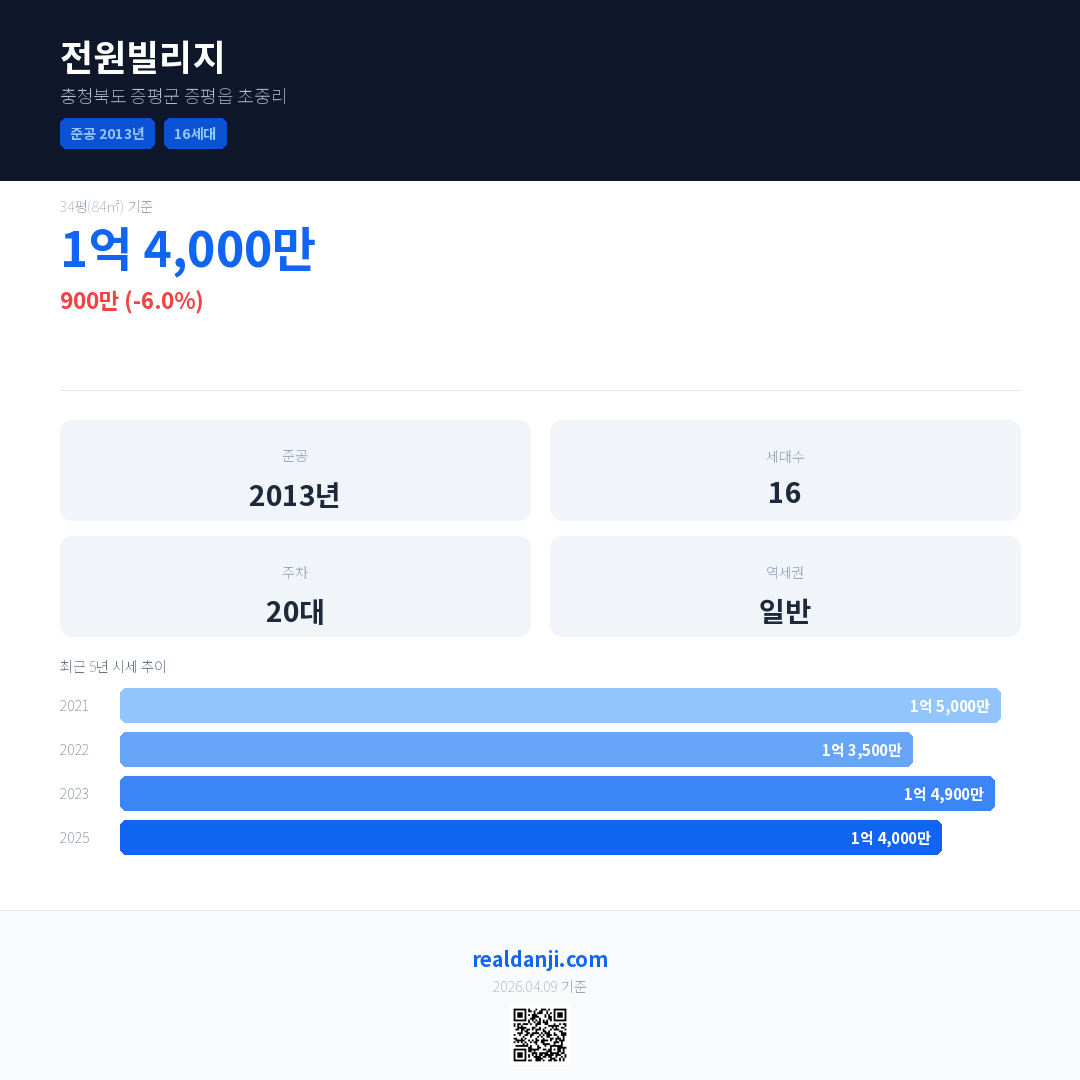 전원빌리지 국민평형 기준 2025년 평균 거래가는 1억 4,000만으로, 전년 대비 6.0% 하락 했습니다.