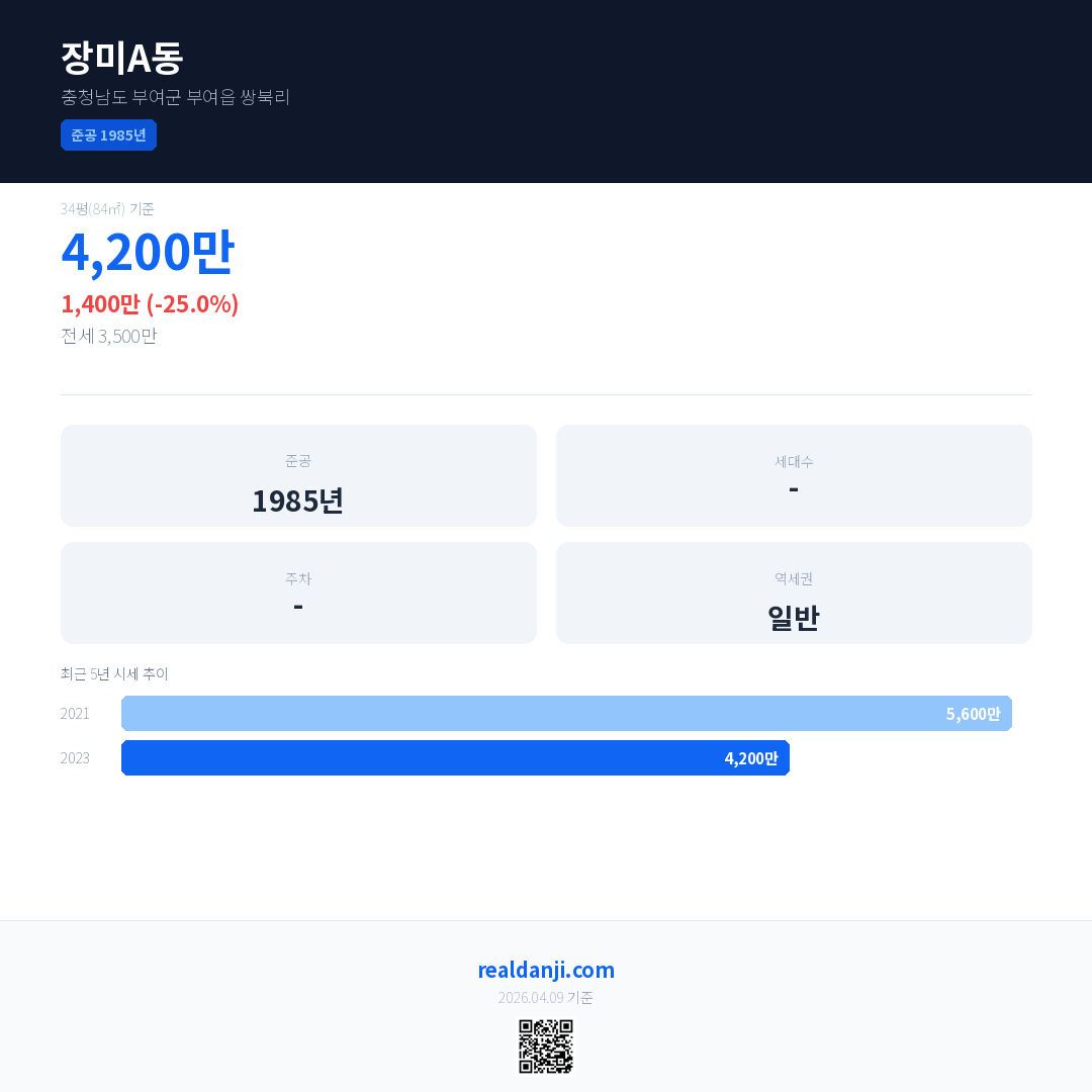 장미A동 국민평형 기준 2023년 평균 거래가는 4,200만으로, 전년 대비 25.0% 하락 했습니다.