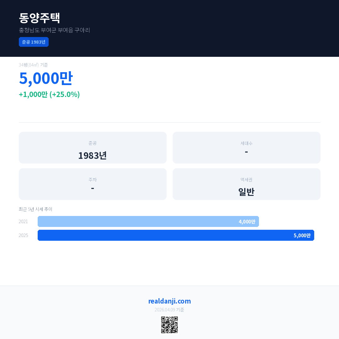 동양주택 국민평형 기준 2025년 평균 거래가는 5,000만으로, 전년 대비 25.0% 상승 했습니다.