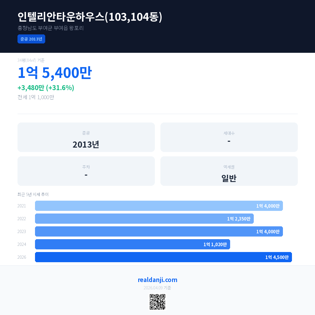 인텔리안타운하우스(103,104동) 최근 거래가는 1억 4,500만입니다. (2026-04)