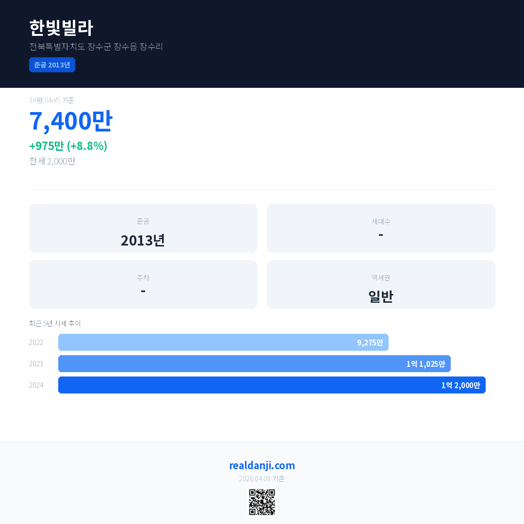 한빛빌라 국민평형 기준 2024년 평균 거래가는 1억 2,000만으로, 전년 대비 8.8% 상승 했습니다.