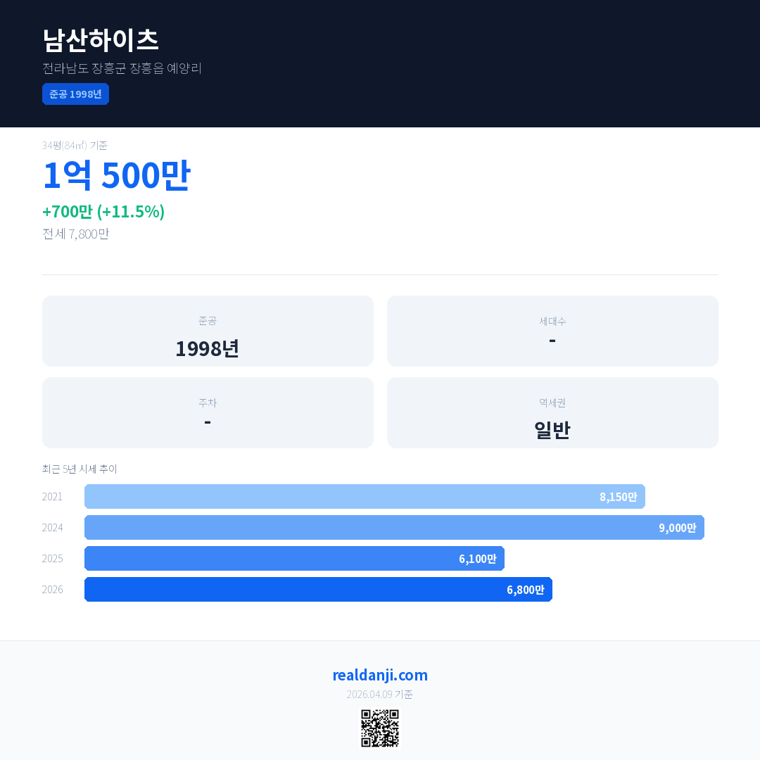 남산하이츠 국민평형 기준 2026년 평균 거래가는 6,800만으로, 전년 대비 11.5% 상승 했습니다.