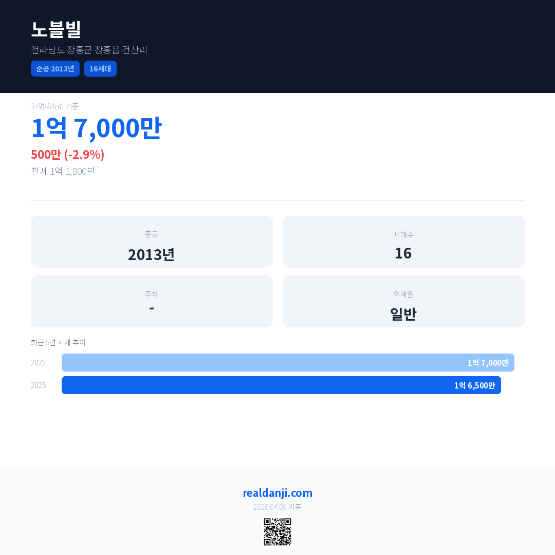 노블빌 국민평형 기준 2025년 평균 거래가는 1억 6,500만으로, 전년 대비 2.9% 하락 했습니다.