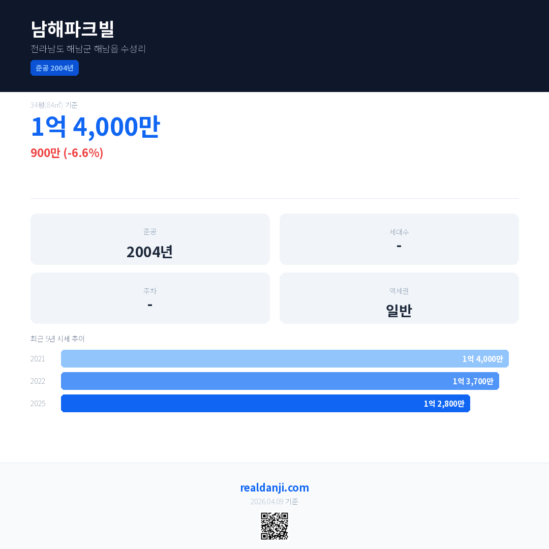 남해파크빌 최근 거래가는 1억 4,000만입니다. (2025-10)