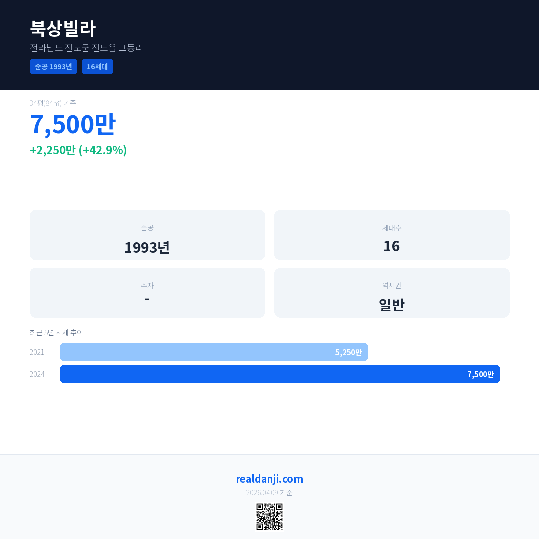 북상빌라 국민평형 기준 2024년 평균 거래가는 7,500만으로, 전년 대비 42.9% 상승 했습니다.