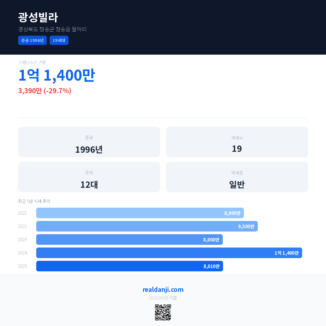 광성빌라 국민평형 기준 2025년 평균 거래가는 8,010만으로, 전년 대비 29.7% 하락 했습니다.