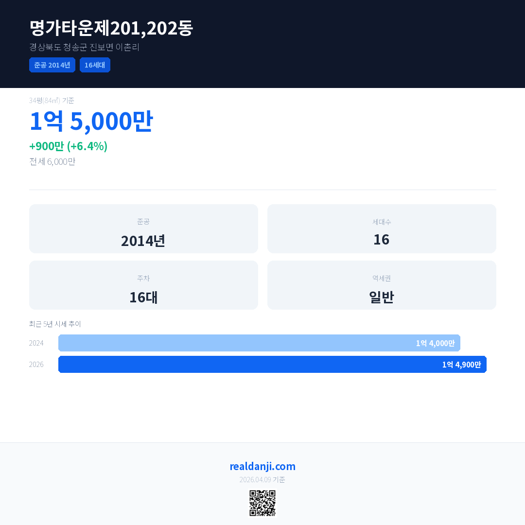 명가타운제201,202동 국민평형 기준 2026년 평균 거래가는 1억 4,900만으로, 전년 대비 6.4% 상승 했습니다.