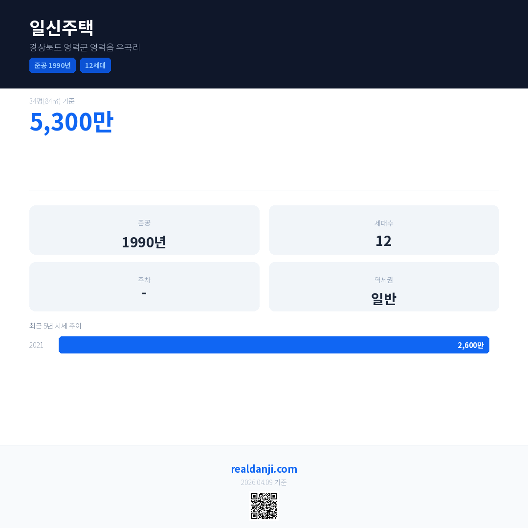 일신주택 국민평형 기준 2021년 평균 거래가는 2,600만으로, 전년 대비 38.1% 하락 했습니다.