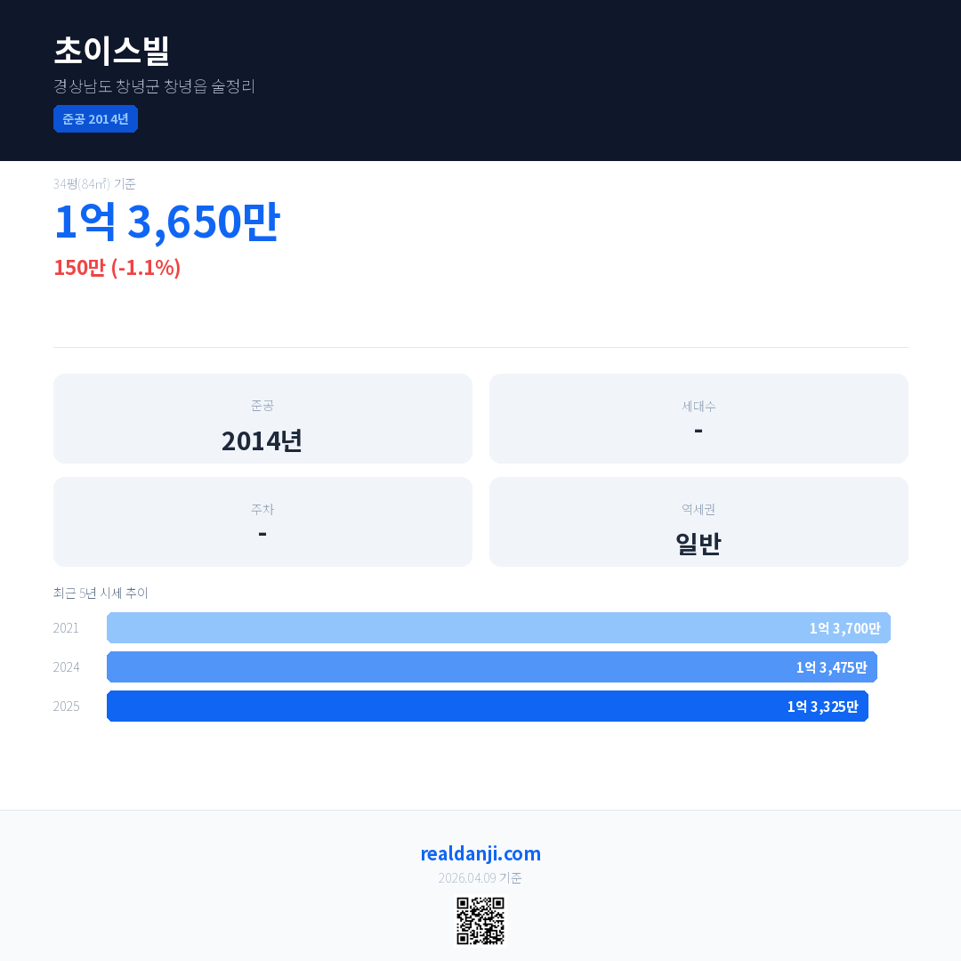 초이스빌 국민평형 기준 2025년 평균 거래가는 1억 3,325만으로, 전년 대비 1.1% 하락 했습니다.