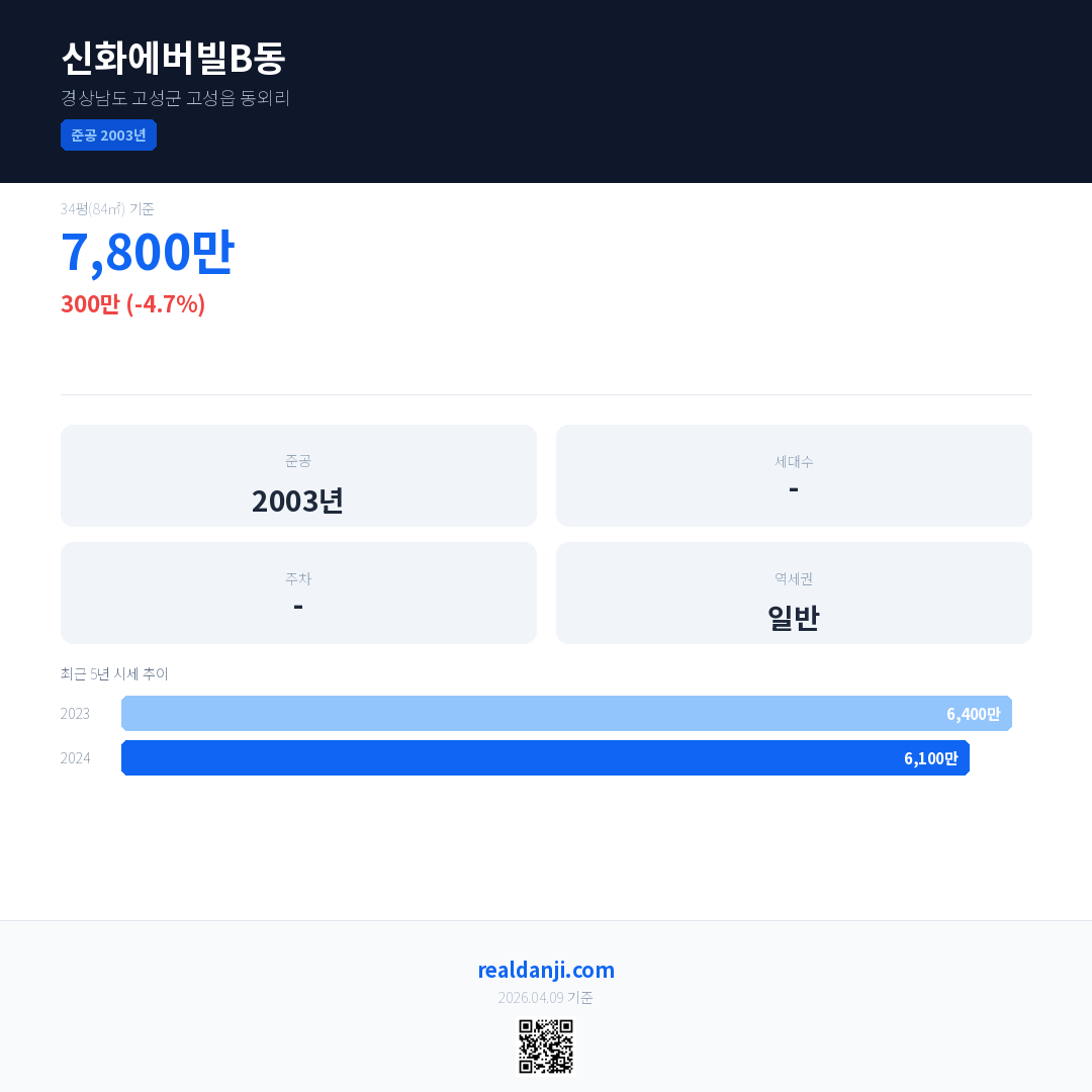 신화에버빌B동 국민평형 기준 2024년 평균 거래가는 6,100만으로, 전년 대비 4.7% 하락 했습니다.
