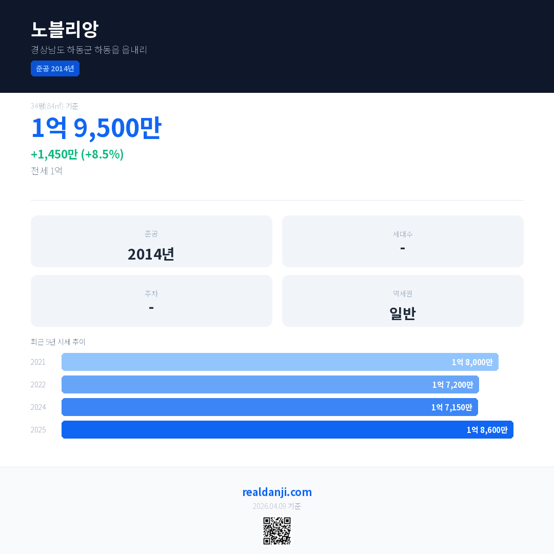 노블리앙 국민평형 기준 2025년 평균 거래가는 1억 8,600만으로, 전년 대비 8.5% 상승 했습니다.