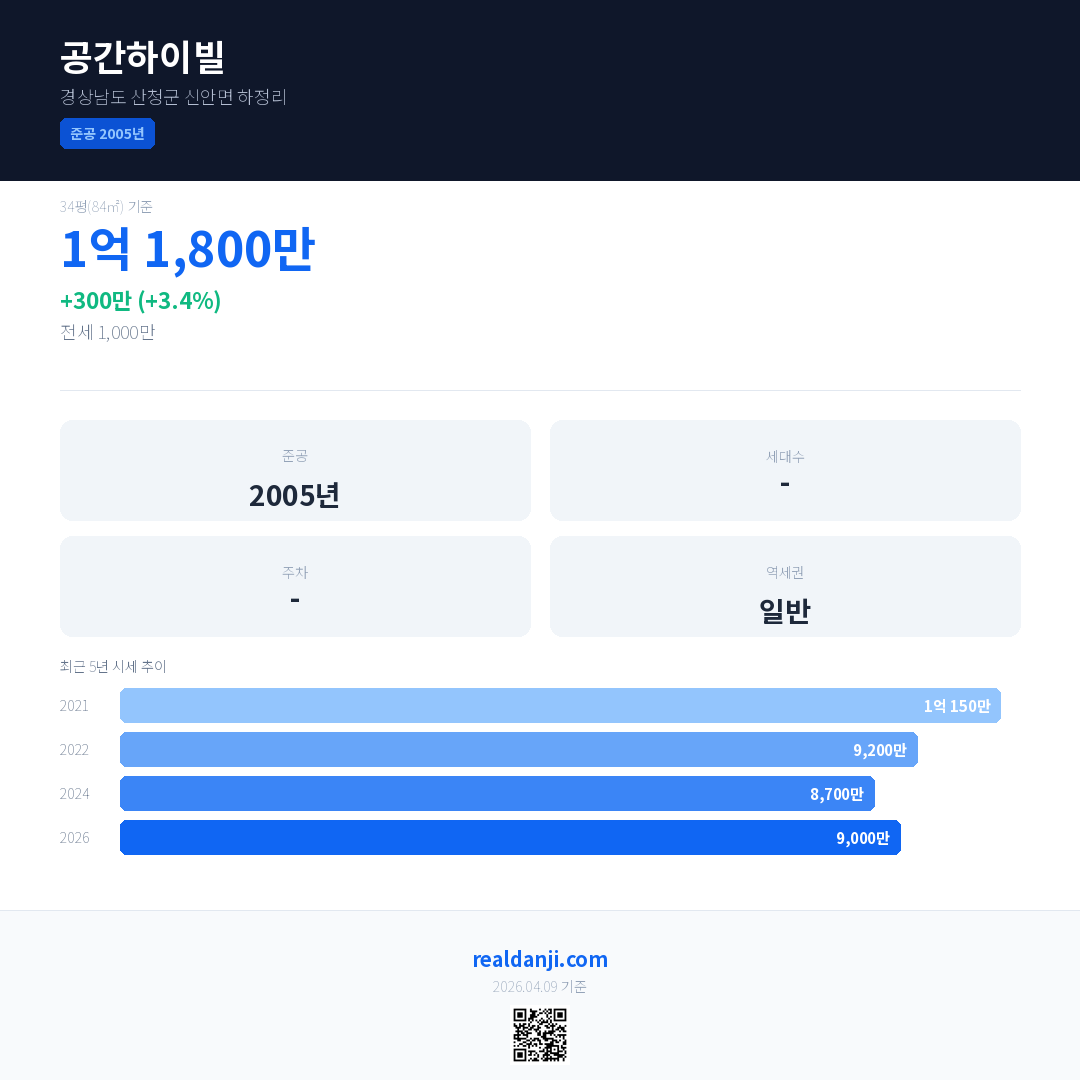 공간하이빌 국민평형 기준 2026년 평균 거래가는 9,000만으로, 전년 대비 3.4% 상승 했습니다.