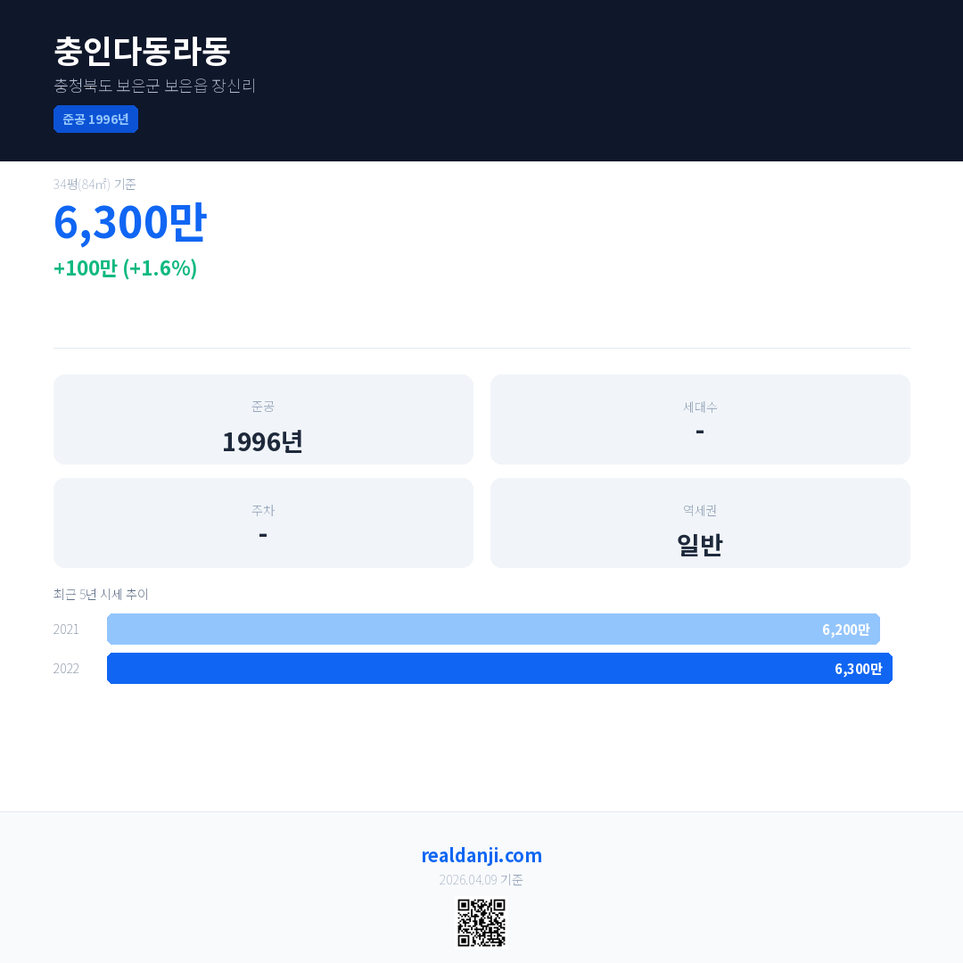 충인다동라동 국민평형 기준 2022년 평균 거래가는 6,300만으로, 전년 대비 1.6% 상승 했습니다.