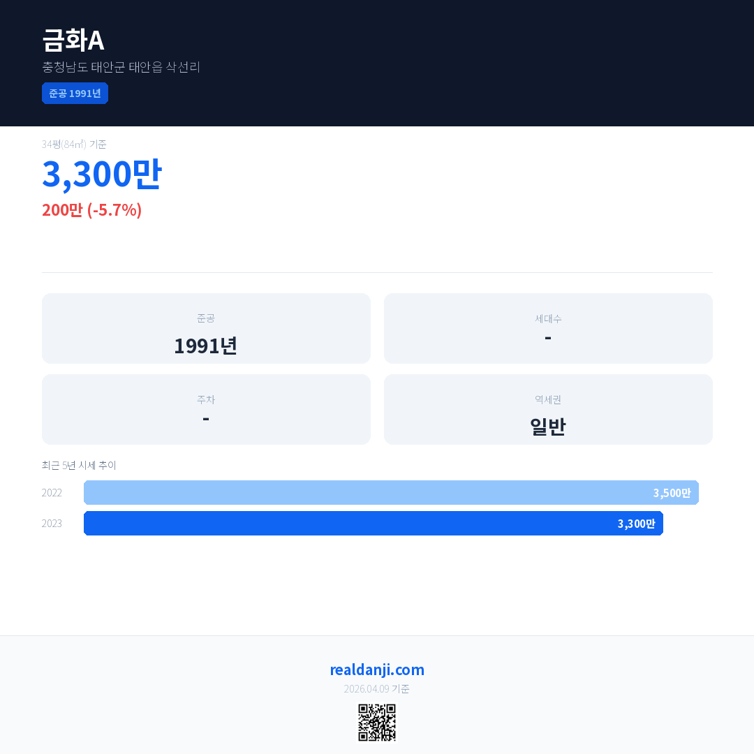 금화A 국민평형 기준 2023년 평균 거래가는 3,300만으로, 전년 대비 5.7% 하락 했습니다.