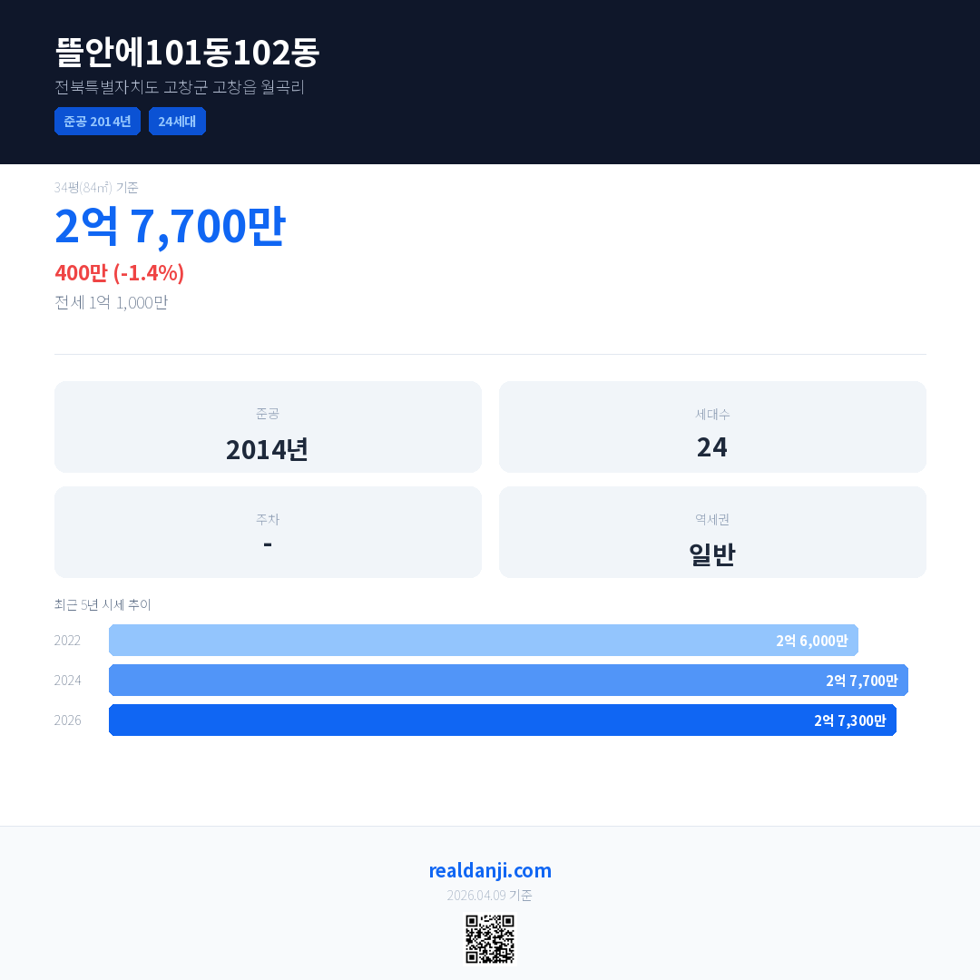 뜰안에101동102동 국민평형 기준 2026년 평균 거래가는 2억 7,300만으로, 전년 대비 1.4% 하락 했습니다.
