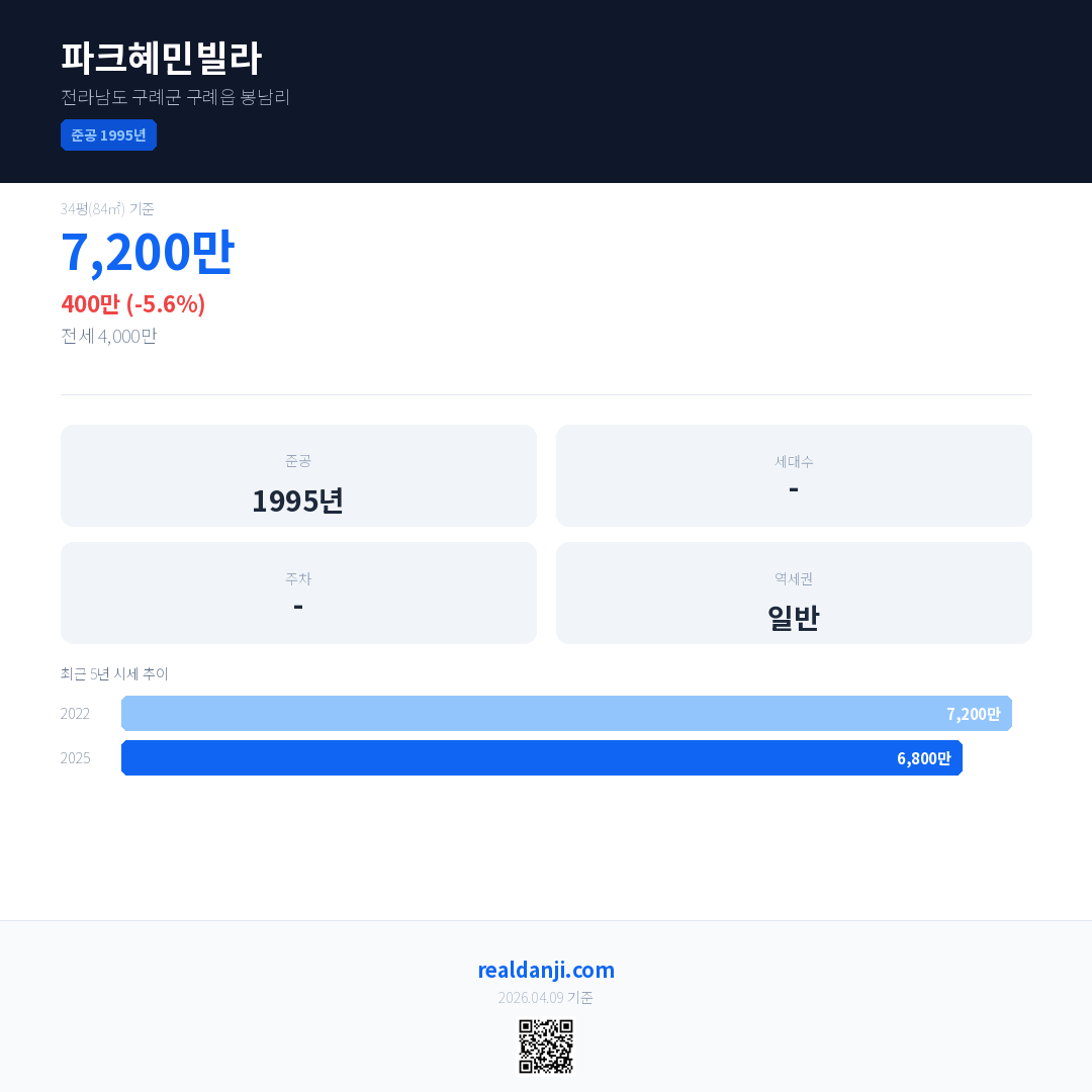 파크혜민빌라 국민평형 기준 2025년 평균 거래가는 6,800만으로, 전년 대비 5.6% 하락 했습니다.