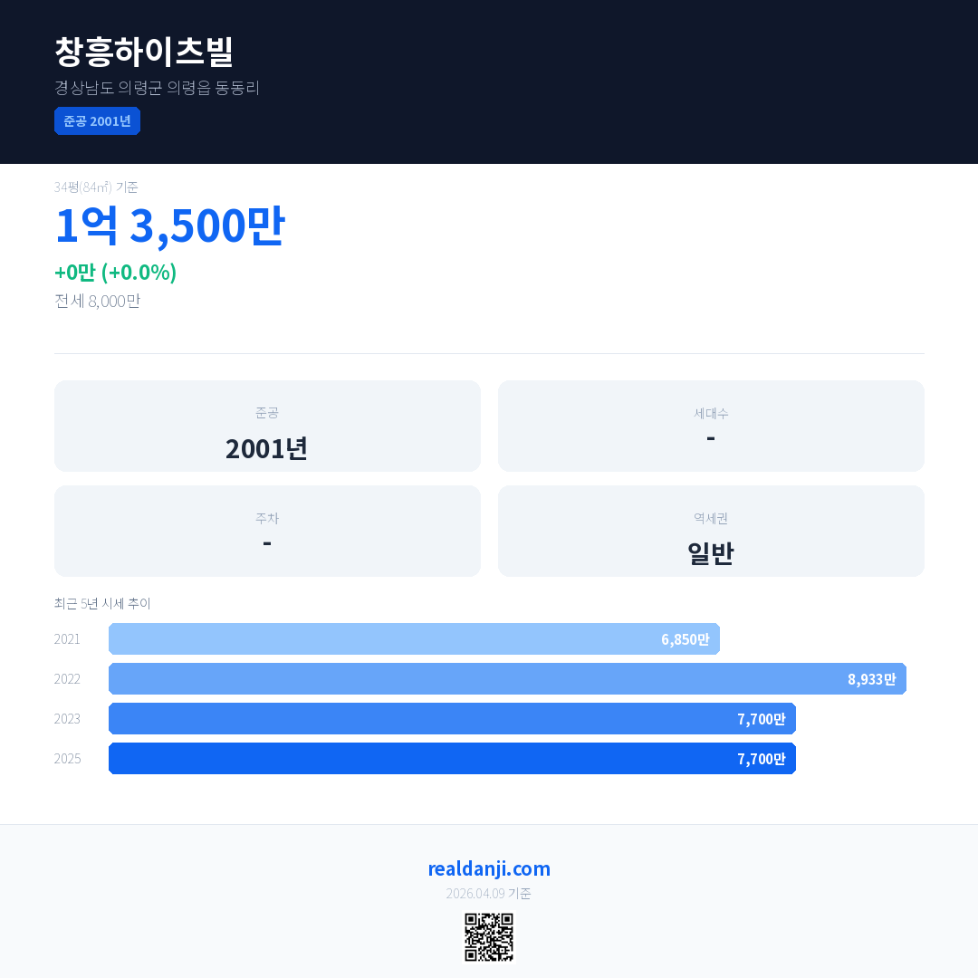 창흥하이츠빌 국민평형 기준 2025년 평균 거래가는 7,700만으로, 전년 대비 0.0% 하락 했습니다.