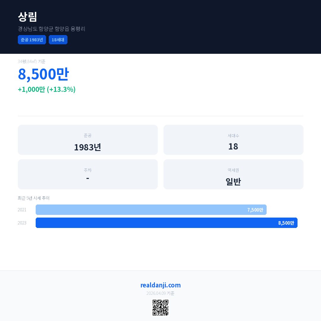 상림 국민평형 기준 2023년 평균 거래가는 8,500만으로, 전년 대비 13.3% 상승 했습니다.