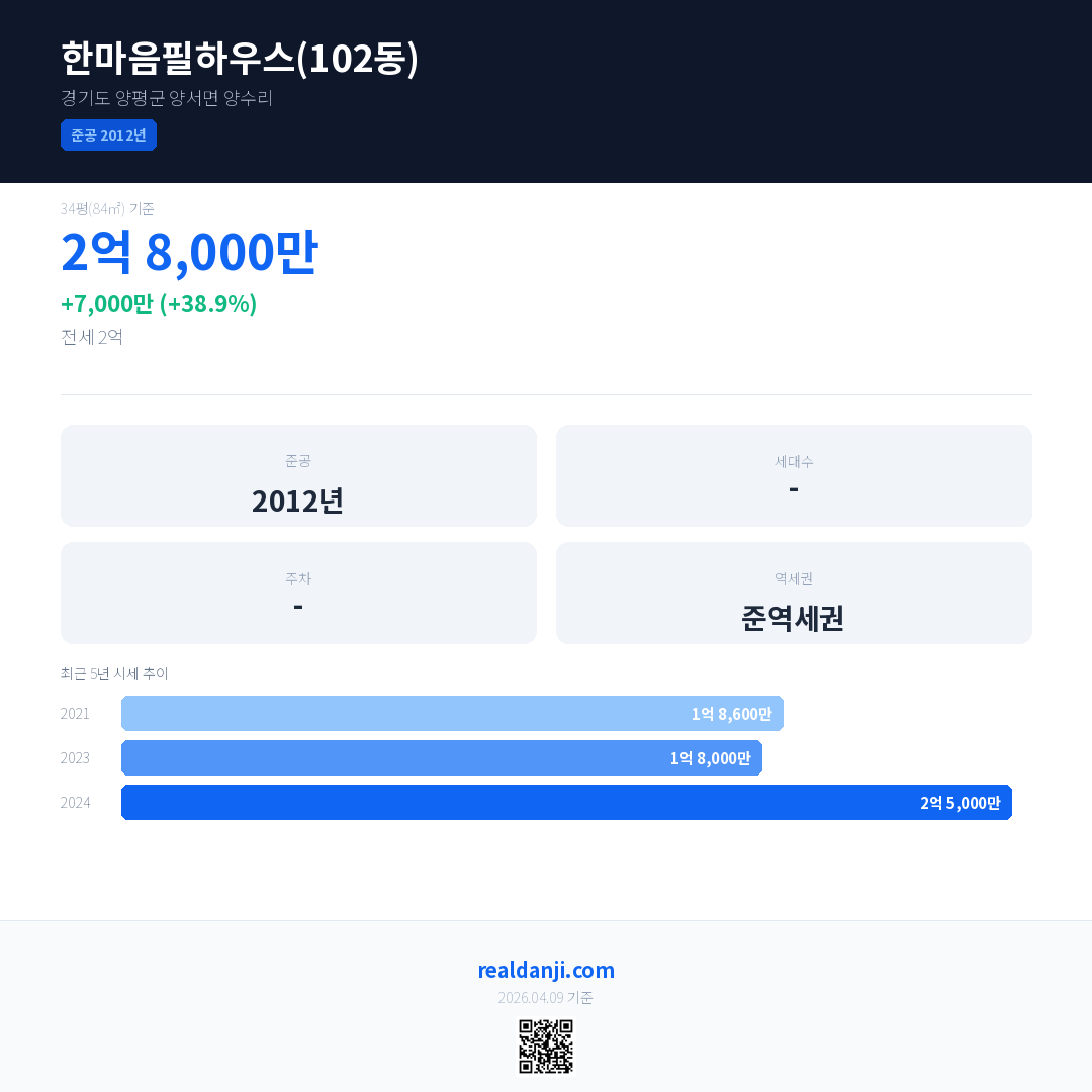 한마음필하우스(102동) 최근 거래가는 2억 8,000만입니다. (2024-04)