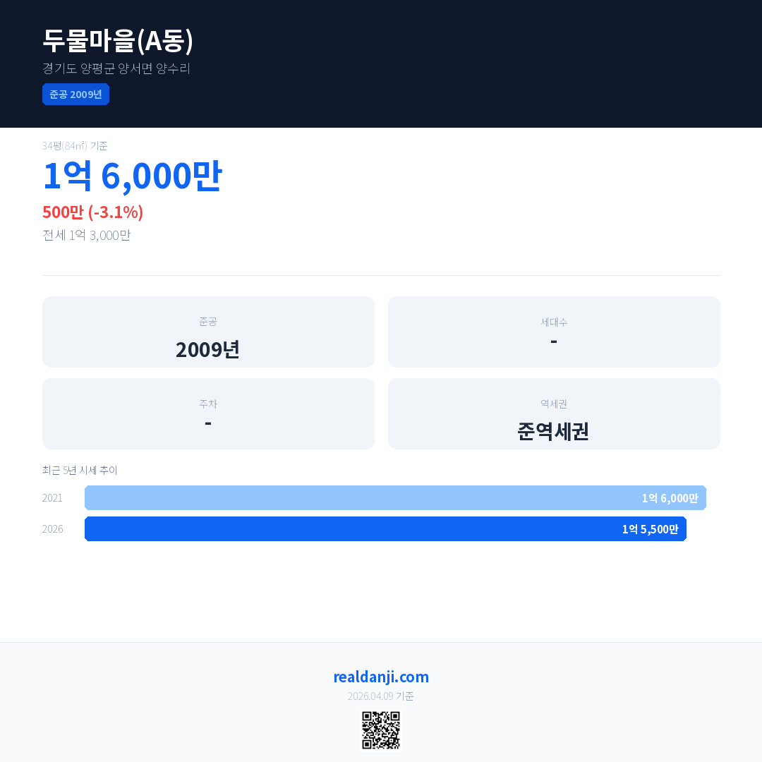두물마을(A동)은(는) 2009년에 준공되었으며, 현재 17년차입니다.