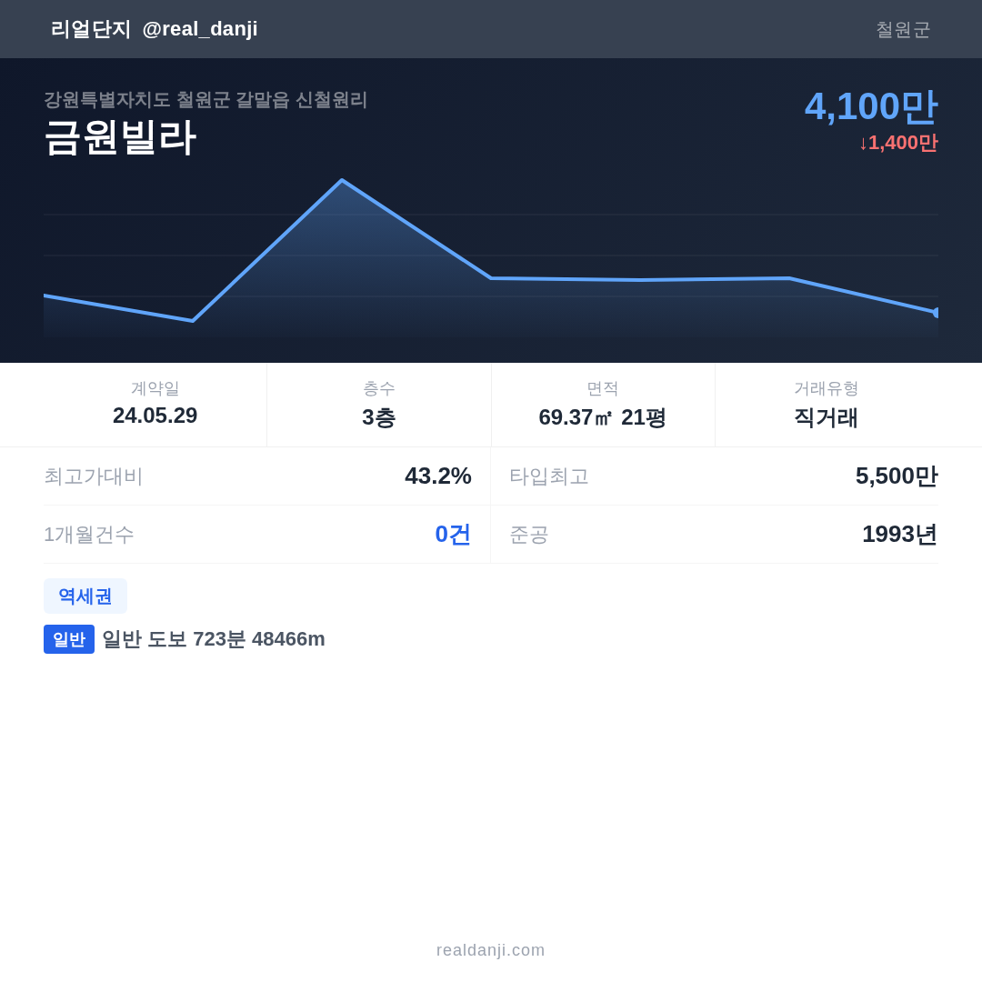 금원빌라 국민평형 기준 2024년 평균 거래가는 4,100만으로, 전년 대비 25.5% 하락 했습니다.