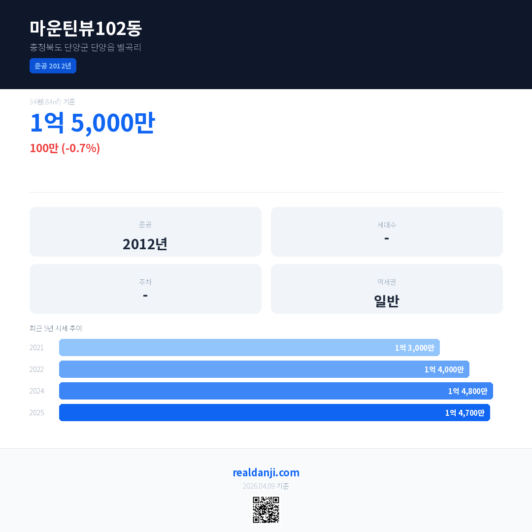 마운틴뷰102동 최근 거래가는 1억 5,000만입니다. (2025-03)