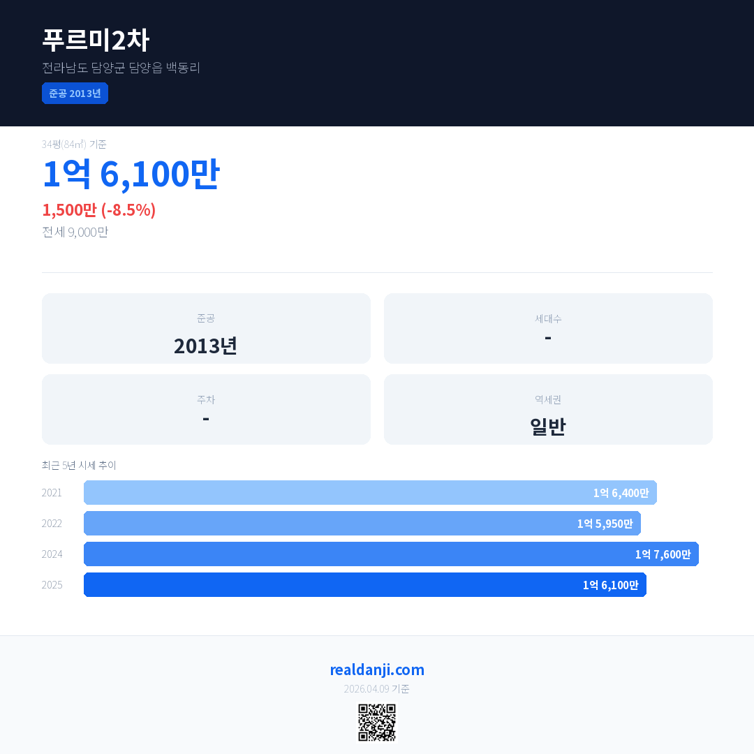 푸르미2차 국민평형 기준 2025년 평균 거래가는 1억 6,100만으로, 전년 대비 8.5% 하락 했습니다.