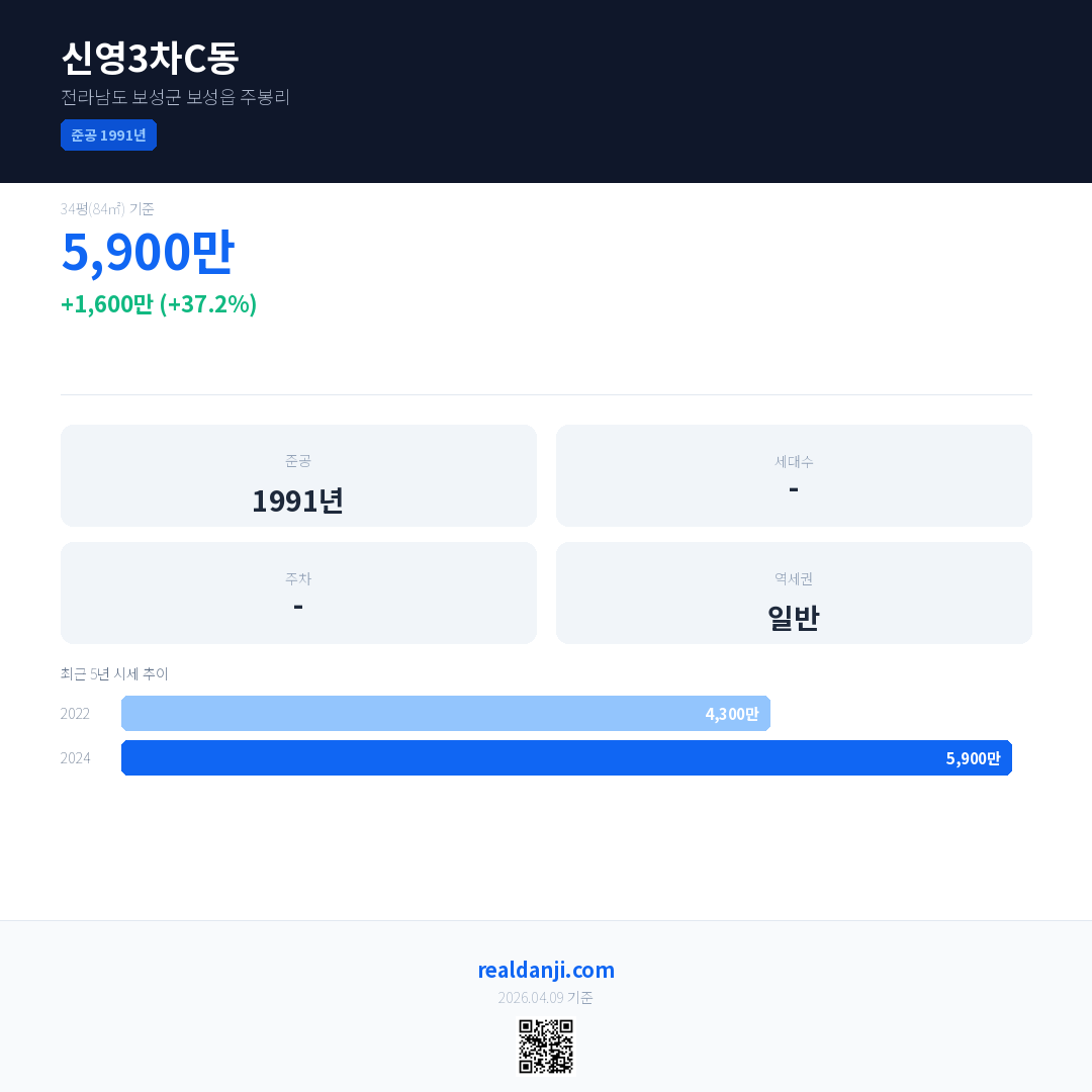 신영3차C동 국민평형 기준 2024년 평균 거래가는 5,900만으로, 전년 대비 37.2% 상승 했습니다.