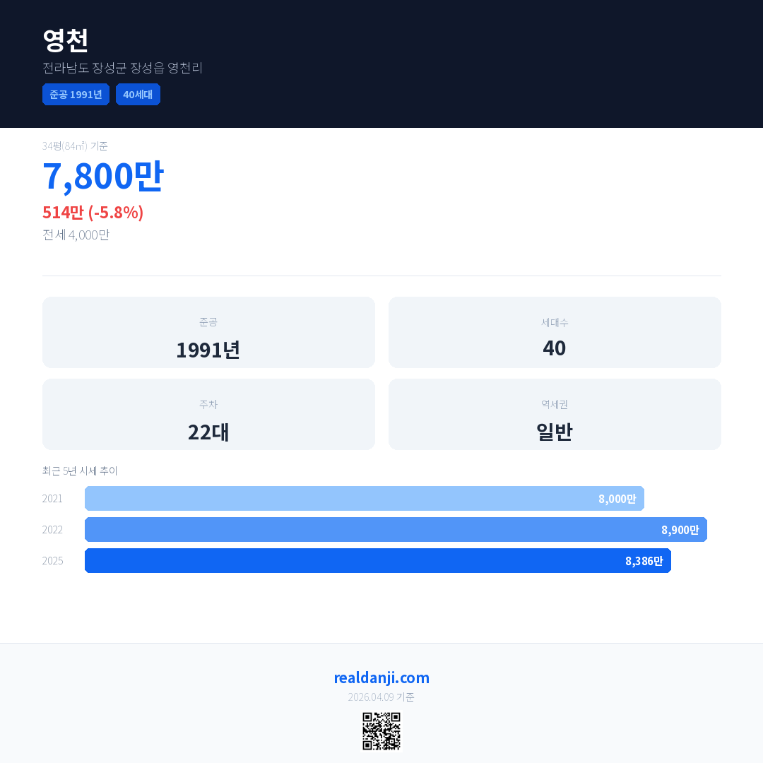 영천은(는) 1991년에 준공되었으며, 현재 35년차입니다. 총 40세대 규모입니다.