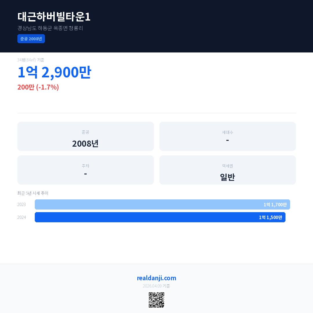 대근하버빌타운1 국민평형 기준 2024년 평균 거래가는 1억 1,500만으로, 전년 대비 1.7% 하락 했습니다.