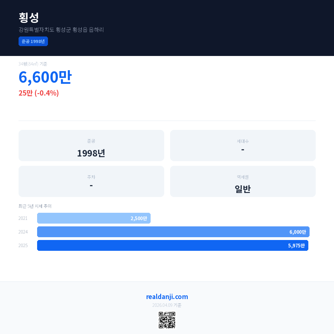 횡성 국민평형 기준 2025년 평균 거래가는 5,975만으로, 전년 대비 0.4% 하락 했습니다.