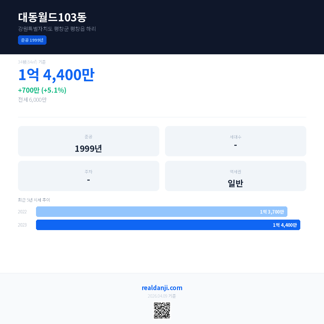 대동월드103동 국민평형 기준 2023년 평균 거래가는 1억 4,400만으로, 전년 대비 5.1% 상승 했습니다.