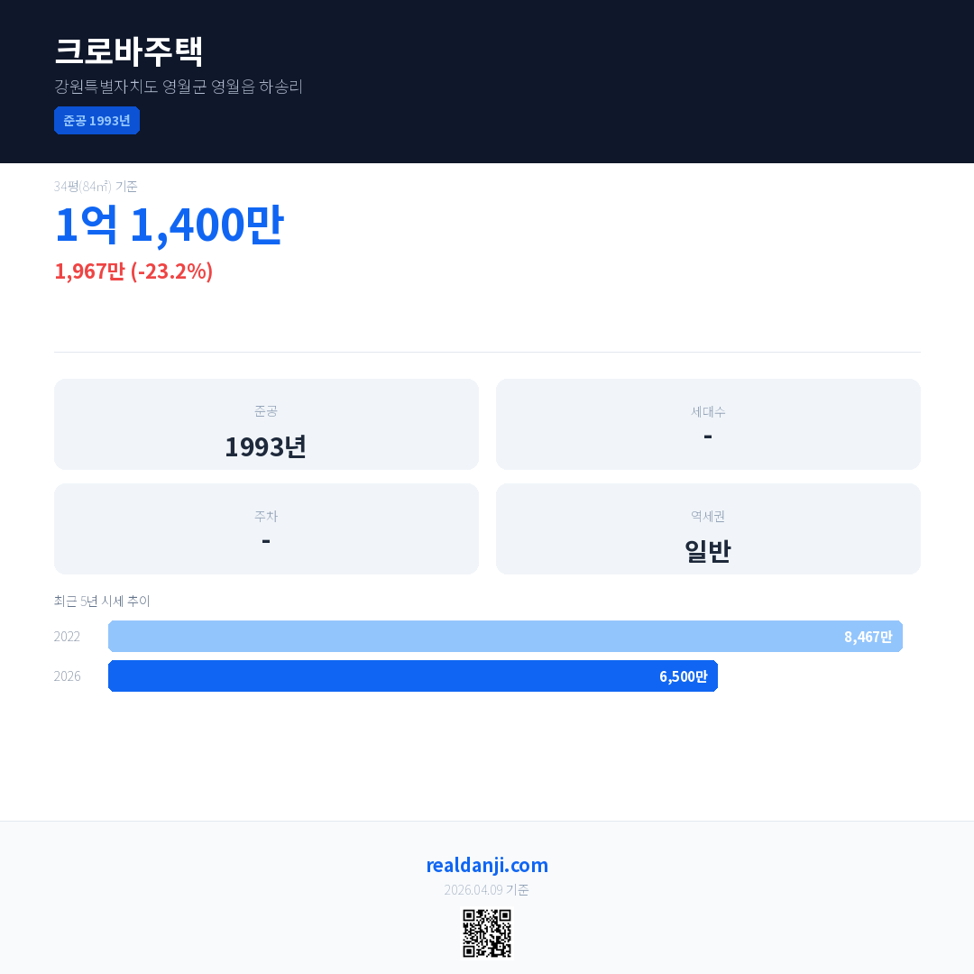 크로바주택 국민평형 기준 2026년 평균 거래가는 6,500만으로, 전년 대비 23.2% 하락 했습니다.
