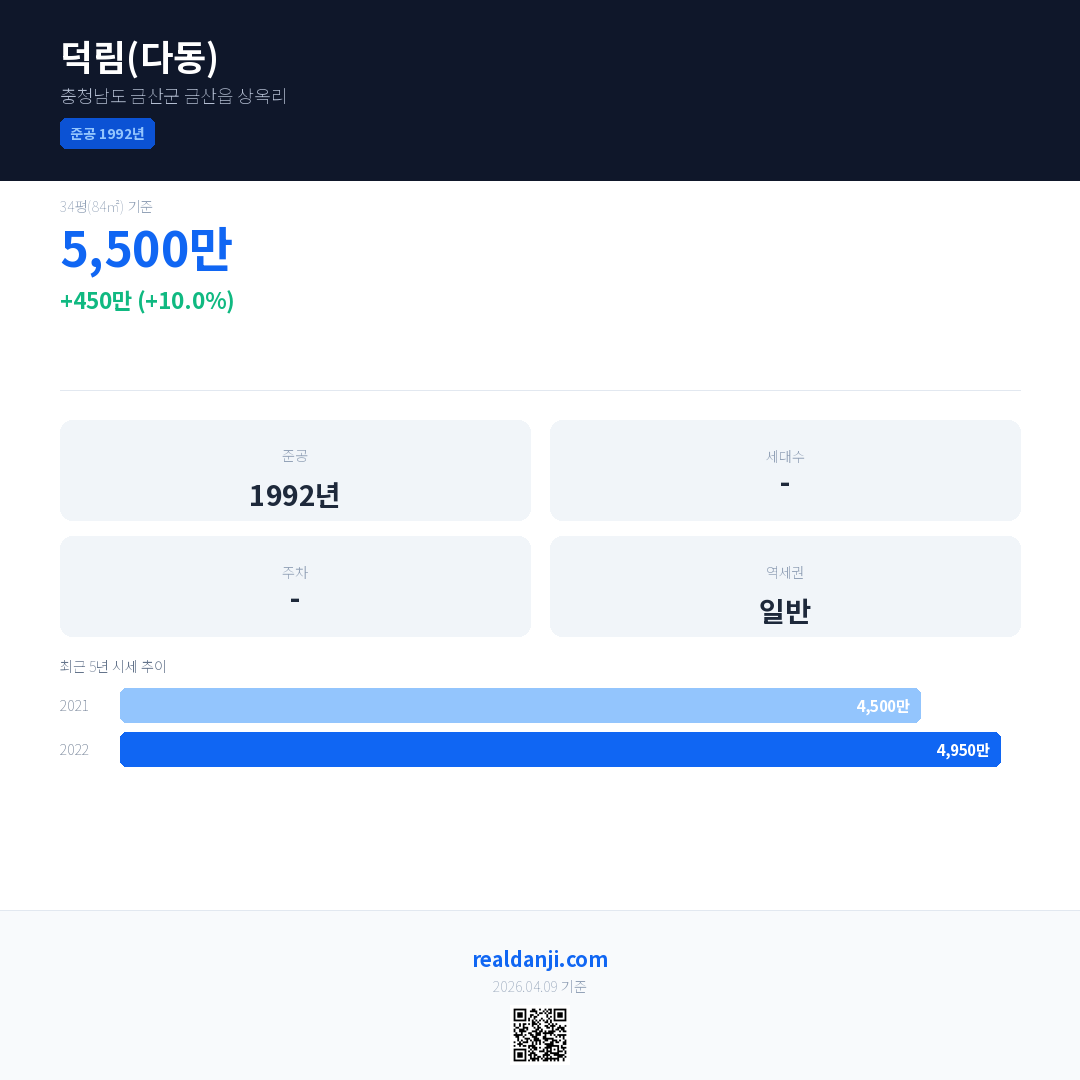 덕림(다동) 국민평형 기준 2022년 평균 거래가는 4,950만으로, 전년 대비 10.0% 상승 했습니다.