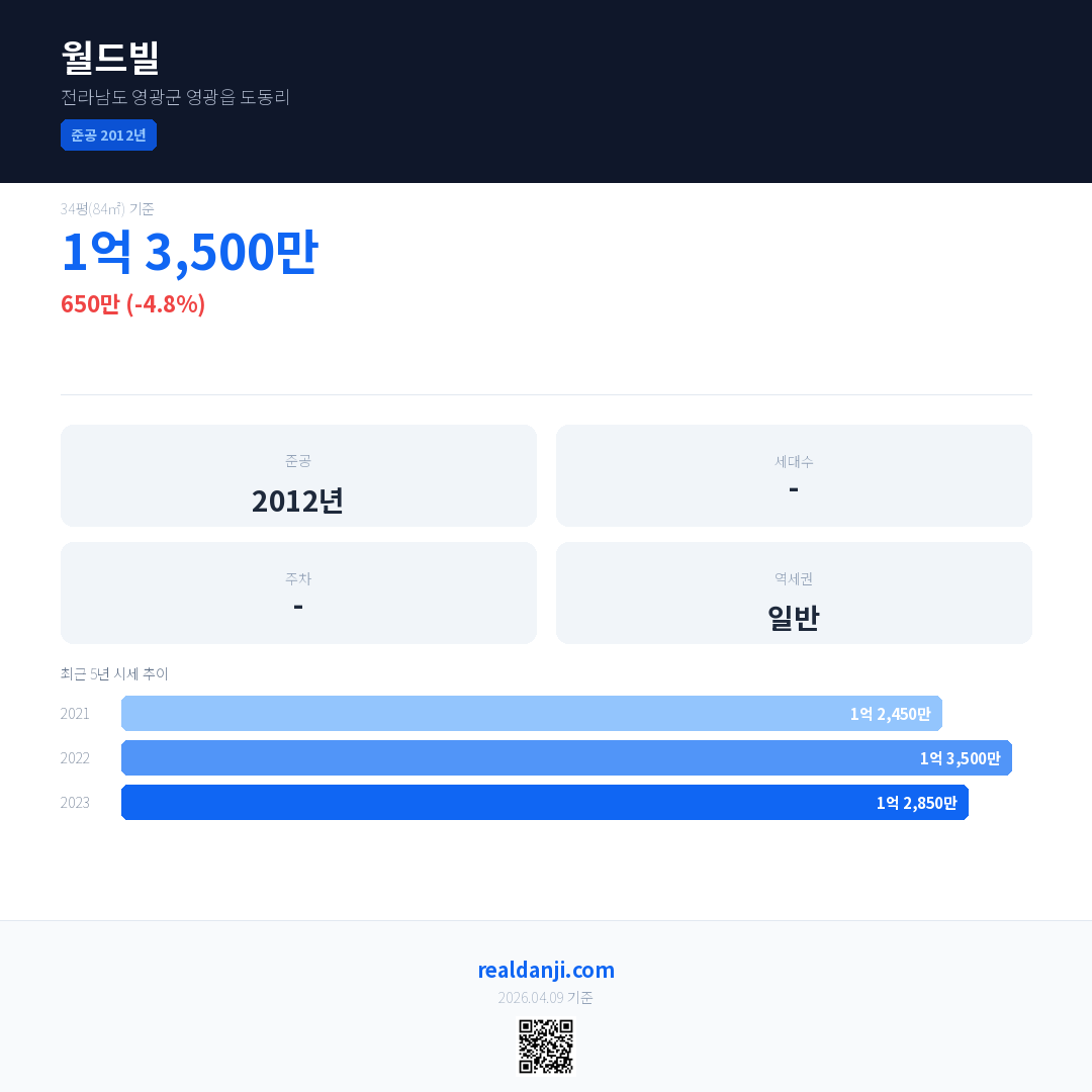 월드빌 국민평형 기준 2023년 평균 거래가는 1억 2,850만으로, 전년 대비 4.8% 하락 했습니다.