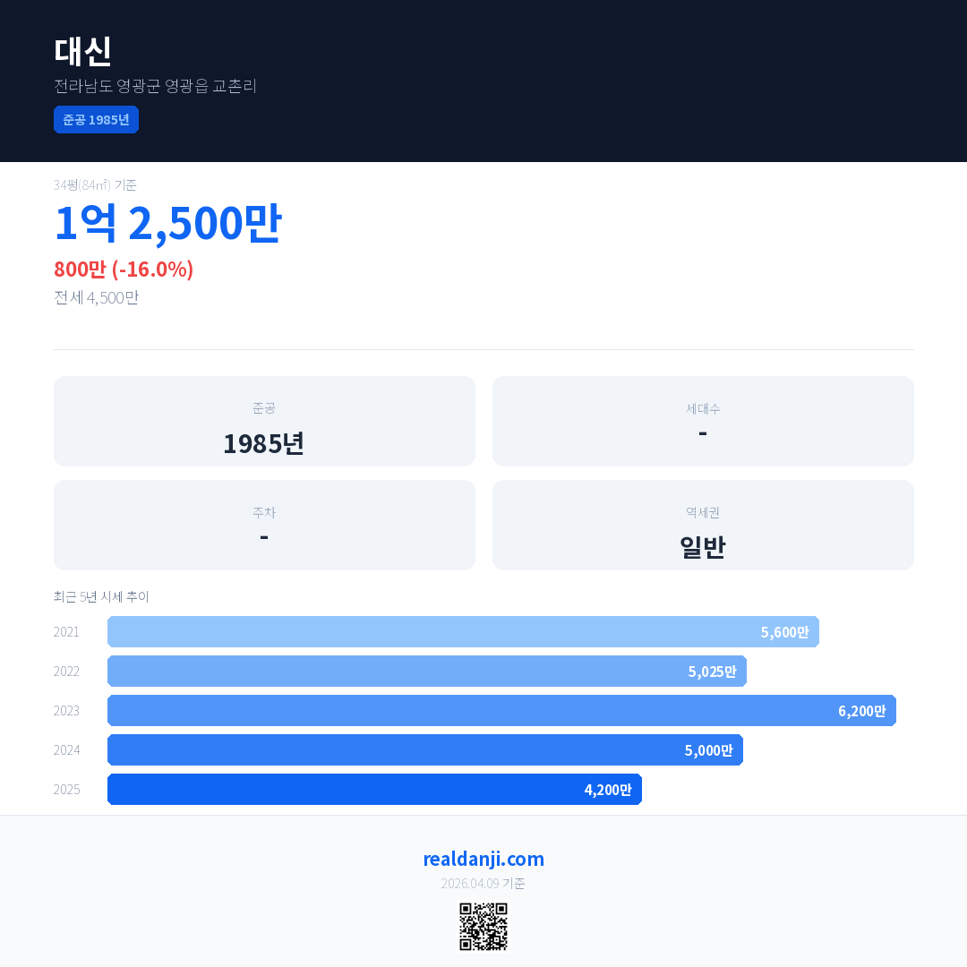 대신 국민평형 기준 2025년 평균 거래가는 4,200만으로, 전년 대비 16.0% 하락 했습니다.