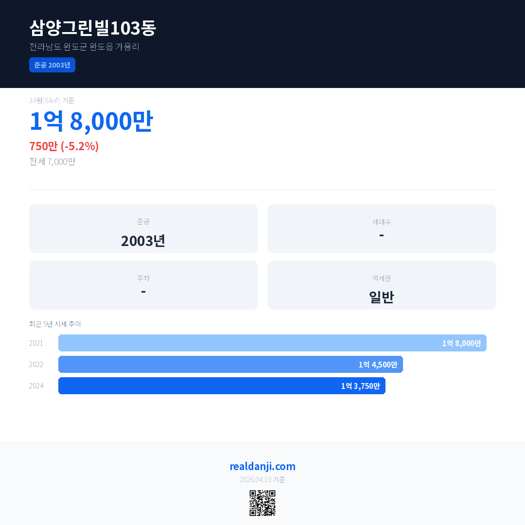 삼양그린빌103동 최근 거래가는 1억 8,000만입니다. (2024-10)
