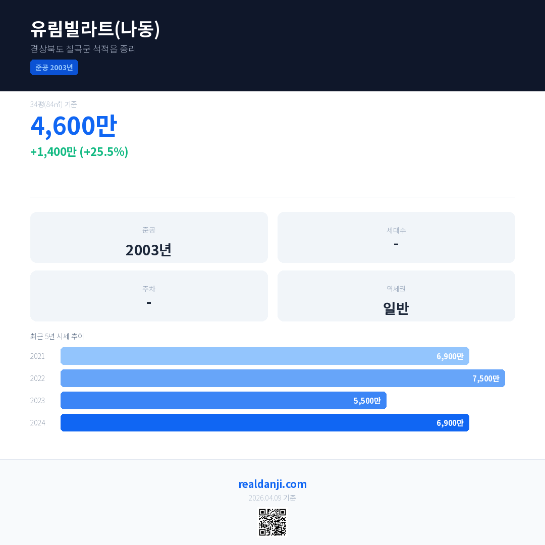 유림빌라트(나동) 국민평형 기준 2024년 평균 거래가는 6,900만으로, 전년 대비 25.5% 상승 했습니다.