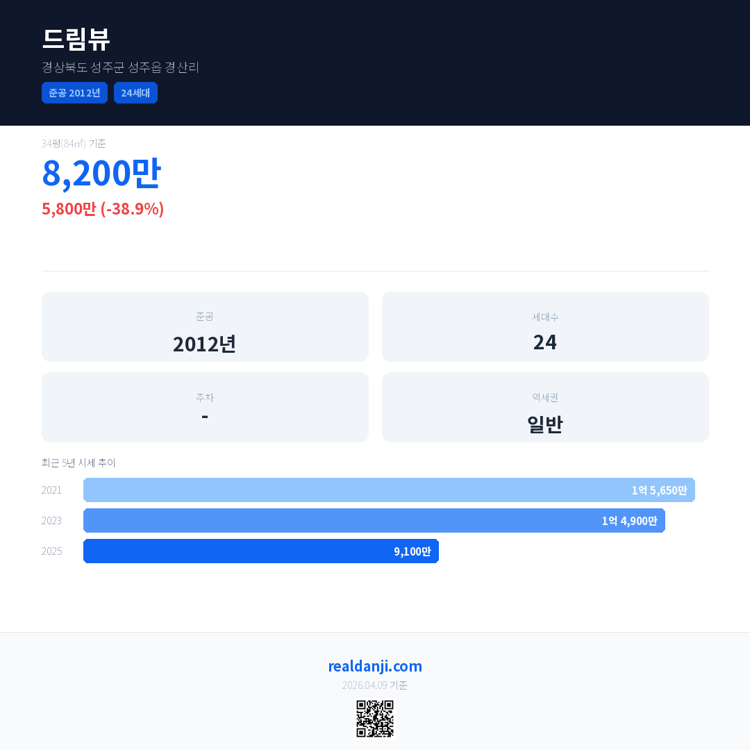 드림뷰 국민평형 기준 2025년 평균 거래가는 9,100만으로, 전년 대비 38.9% 하락 했습니다.