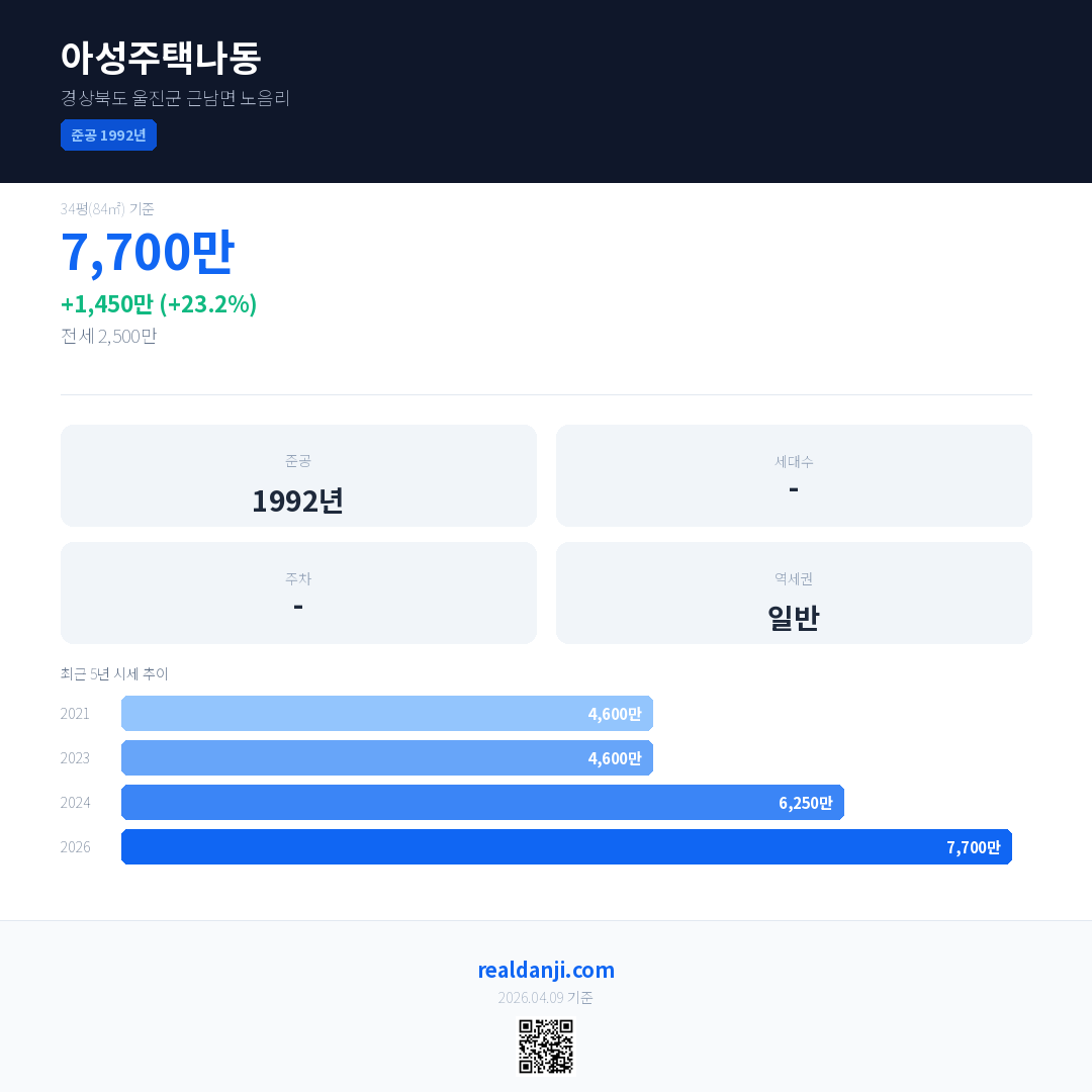 아성주택나동 국민평형 기준 2026년 평균 거래가는 7,700만으로, 전년 대비 23.2% 상승 했습니다.