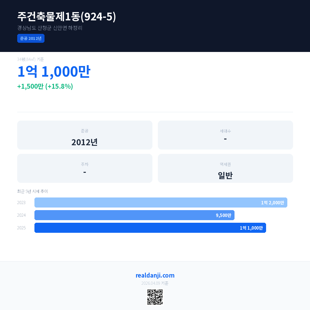 주건축물제1동(924-5) 국민평형 기준 2025년 평균 거래가는 1억 1,000만으로, 전년 대비 15.8% 상승 했습니다.