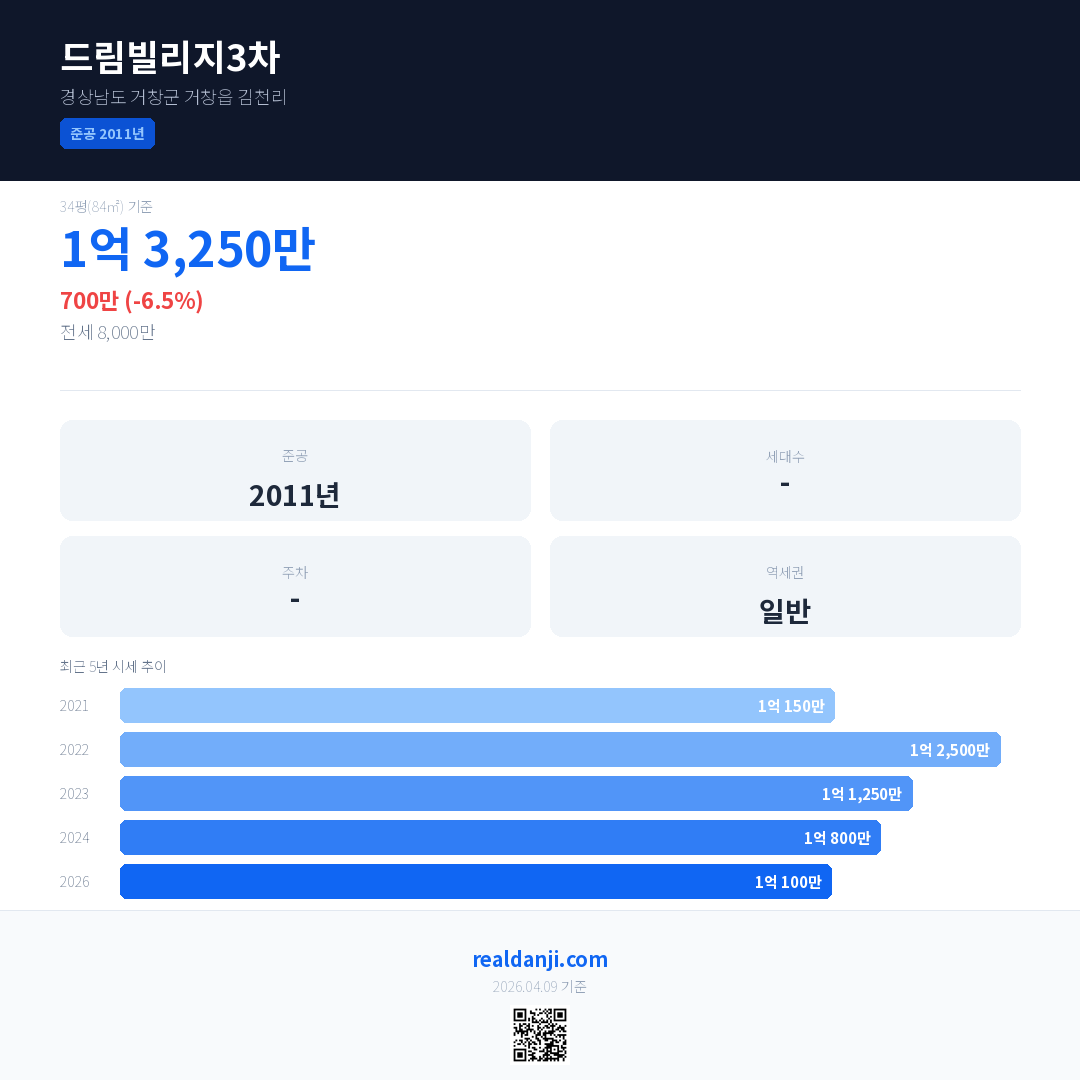 드림빌리지3차 최근 거래가는 1억 3,250만입니다. (2026-01)