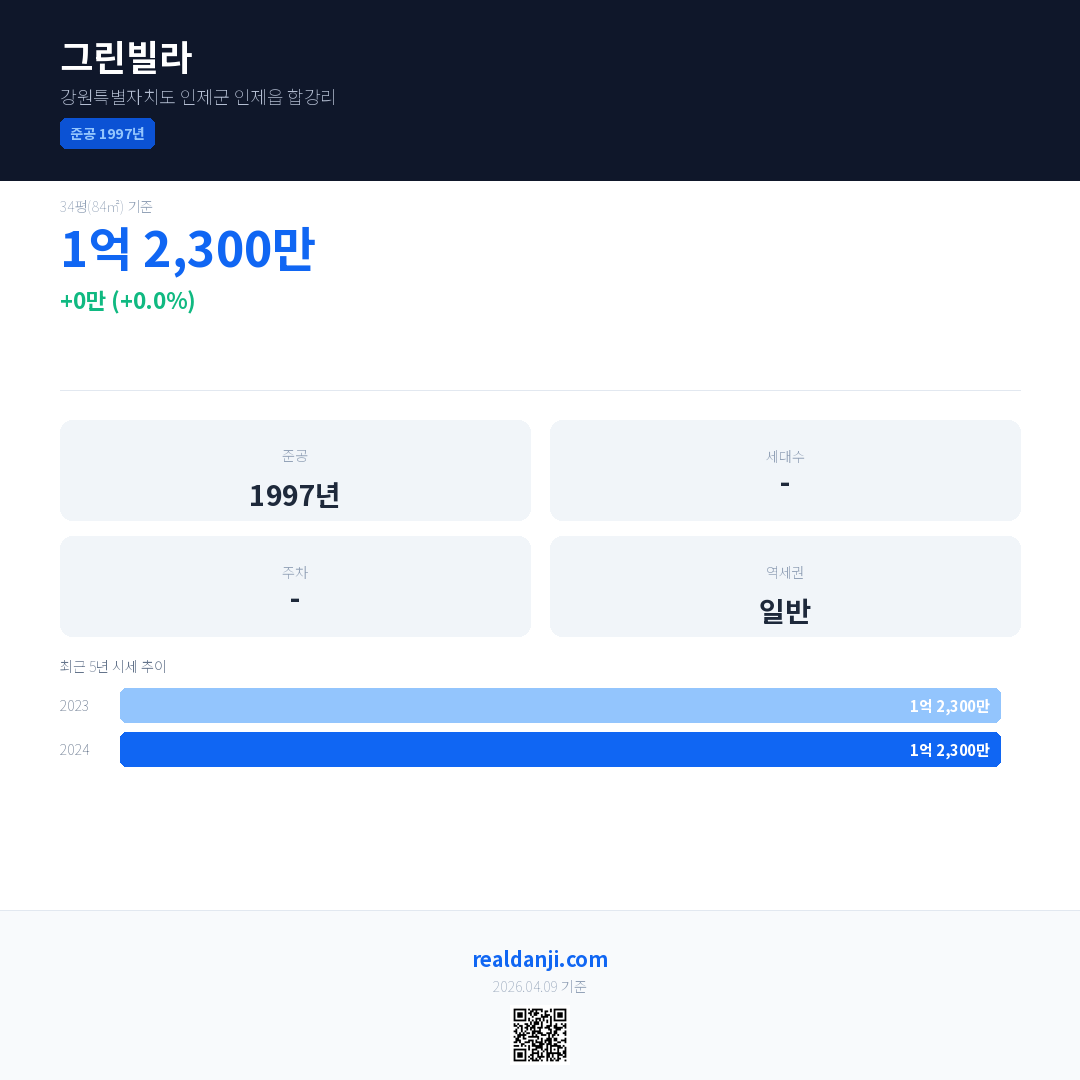 그린빌라 국민평형 기준 2024년 평균 거래가는 1억 2,300만으로, 전년 대비 0.0% 하락 했습니다.