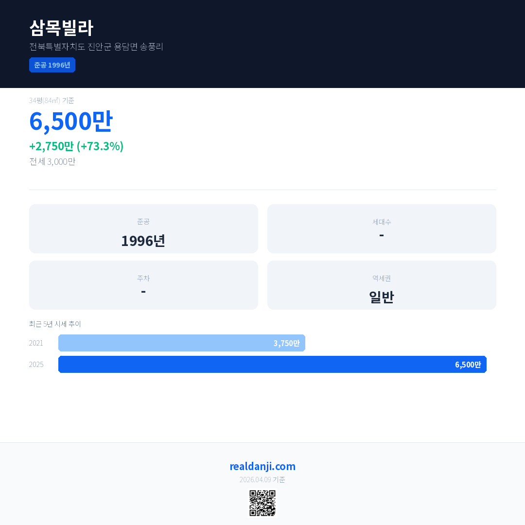 삼목빌라 국민평형 기준 2025년 평균 거래가는 6,500만으로, 전년 대비 73.3% 상승 했습니다.