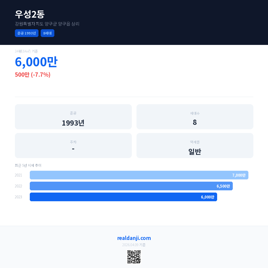 우성2동 국민평형 기준 2023년 평균 거래가는 6,000만으로, 전년 대비 7.7% 하락 했습니다.