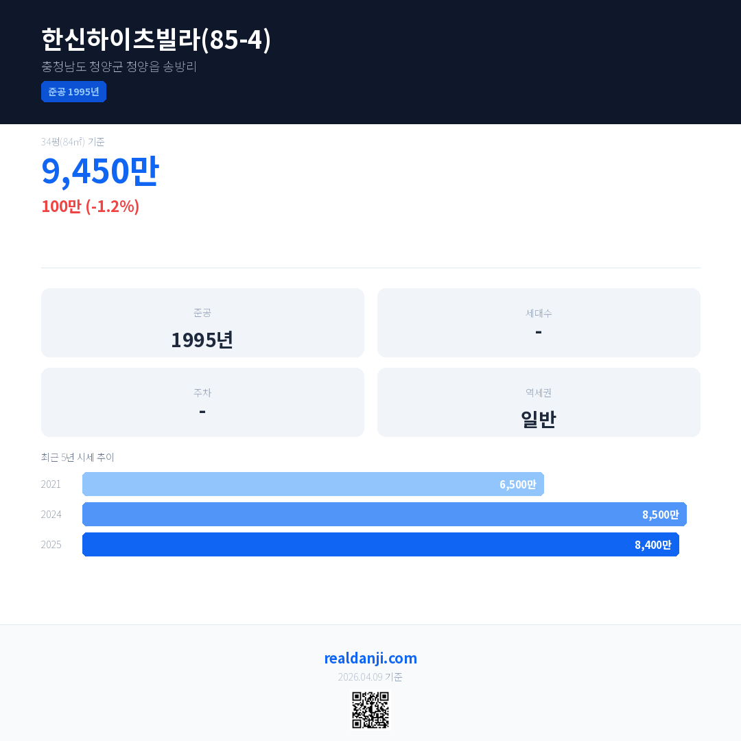 한신하이츠빌라(85-4) 최근 거래가는 9,450만입니다. (2025-03)