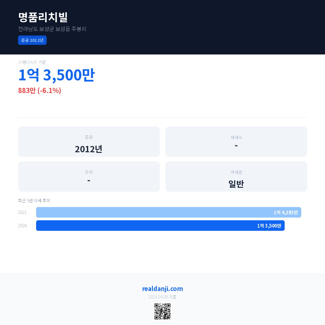 명품리치빌 국민평형 기준 2026년 평균 거래가는 1억 3,500만으로, 전년 대비 6.1% 하락 했습니다.