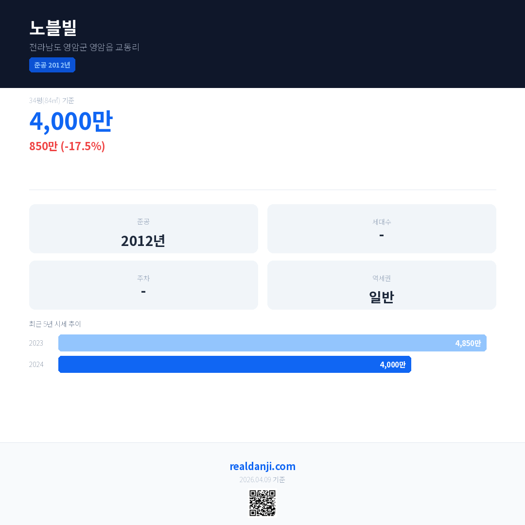 노블빌 국민평형 기준 2024년 평균 거래가는 4,000만으로, 전년 대비 17.5% 하락 했습니다.